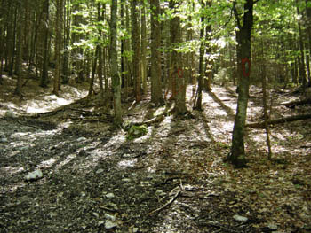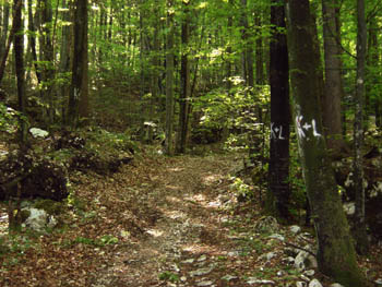 Mesto, ki ga je treba na novo "pomarkirati" - očitno so ob gradnji gozdne ceste posekali kakšno drevo preveč ... Nekdo je z belim in rdečim sprejem naredil nekaj "svojih" markacij - a le-te so velike in na pogled kar malce kričeče. |