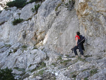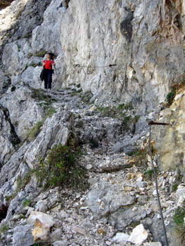 Na Lojtri: To je poševna polica, po kateri so nekoč gonili drobnico na planino Dolga njiva. Za vsak primer je tu žica. |