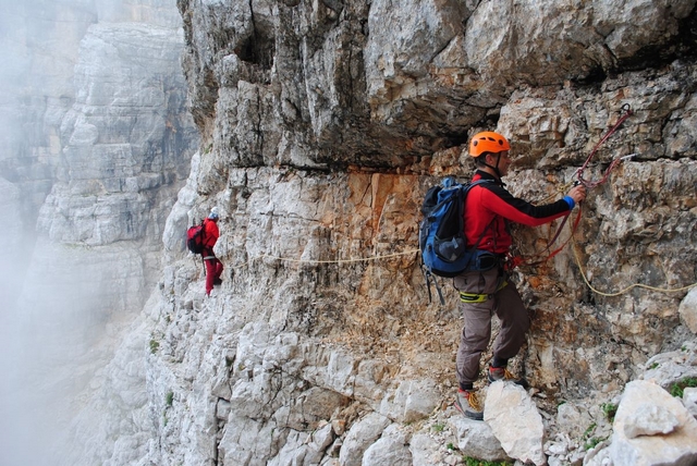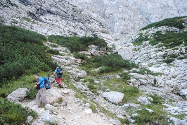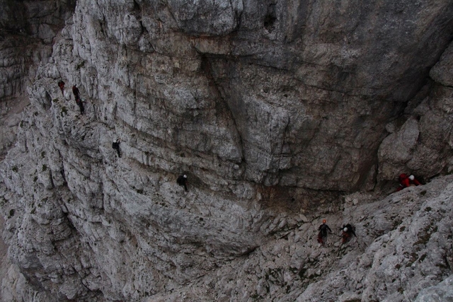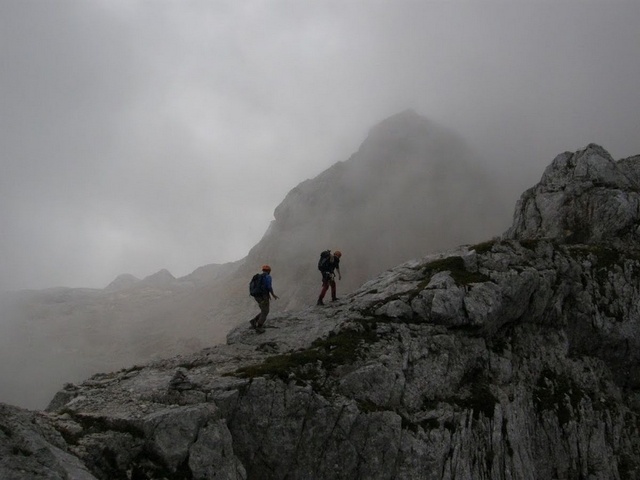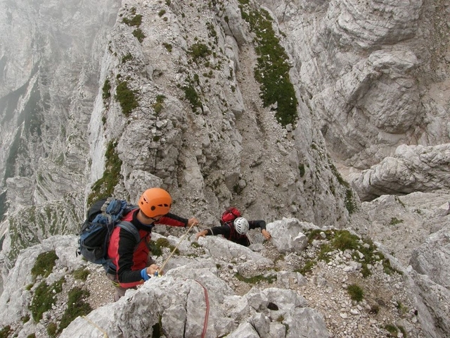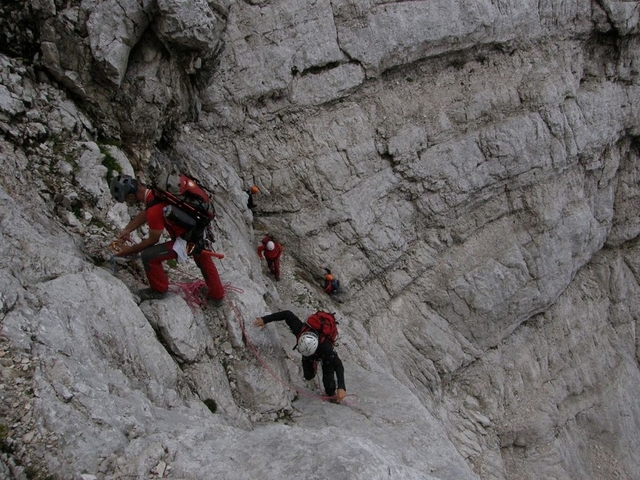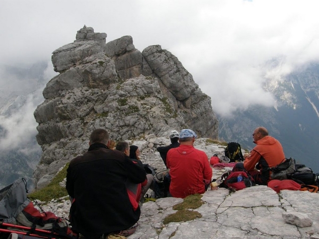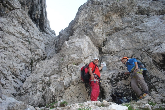Da bom šel nekoč, sicer bolj oz. skoraj zapriseženi šodrovec in ljubitelj težjih zavarovanih poti ter lažjih brezpotij, po Slovenski sem si "godel" že nekaj desetletij, na srečo pa me je prijatelj zdaj le "odrešil" tega trpljenja (zato pa so prijatelji!). Lepo je takole pregoljufati mogočno steno prek njenih "najšibkejših" delov, seveda mora biti poleg nog in rok na mestu tudi s čelado zaščitena glava. Tudi mi smo žal nekajkrat preizkusili tovrstno zaščito, na srečo le z manjšimi padajočimi kamninskimi primerki, ki praviloma (pri-)letijo točno v smeri čelade. Zanimiva je že vstopna baletna prečka, prava uživancija pa se začne šele nad macesni, ko je skala vse bolj in bolj ta prava. Mimo Belih plati se ravno lepo ogreješ za kamin v Bučerjevi steni in počitek na Zlatorogovih policah. Tu smo ujeli prej omenjeno šesterico in se soglasno ter brez arbitraže domenili, komu pripada posamezno od težjih mest, kar nam je omogočilo lažji, hitrejši in složnejši vzpon. Če bi nas posnemali tisti, ki se gredo igrice v Piranskem zalivu, bi zadevo že zdavnaj uredili …
