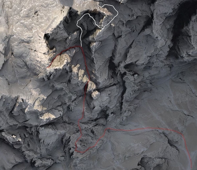 Slovenska smer – GPS sled (rdeča) s Prevčevim izstopom in ročno vrisan potek (bela) proti Slovenskemu turncu.