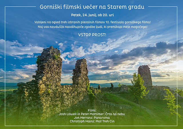 Februarja je v petih krajih po Sloveniji potekal že 10. festival gorniškega filma, ki ga je do sedaj obiskalo že več kot 35 tisoč gledalcev. Del zmagovalnih filmov letošnjega festivala bomo letos predvajali tudi v Kamniku, in sicer v okviru 2. Pohodniškega festivala v Kamniško-Savinjskih Alpah. Gorniški filmski večer bo potekal na prostem, in sicer v petek, 24. junija, od 20. ure dalje na kamniškem Starem gradu. Na ogled bodo trije plezalni filmi, in sicer Črta na nebu, Mož Treh Cin in Panorama.