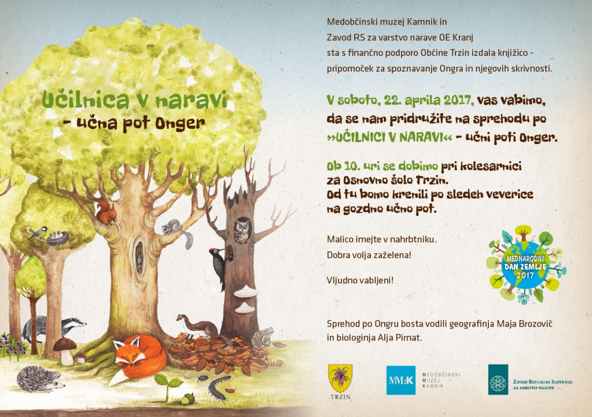 Sprehod po učilnici v naravi - učni poti Onger, v soboto, 22. aprila 2017. Zbor ob 10.00 uri pri kolesarnici za Osnovno šolo Trzin.
