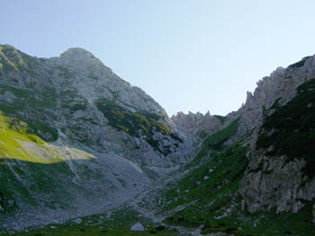 Ko pridete na čudovito uravnavo Jezerca vas desno pozdravi Mali Draški vrh. Desno leži Srenjski preval, preko katerega vodi pot na pl. Lipanca. |