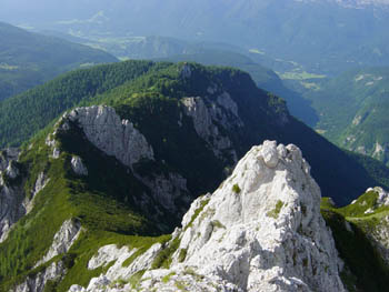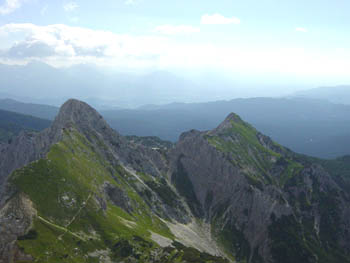 Boštjan in Simon, ki sta očitno najbolje pripravljena sta jo za začetek ucvrla "kot mlada gamsa" na Ablanco. S Studorskega prevala malo krušljivo - pogled na pl. Konjščica pa kot iz letala. |