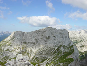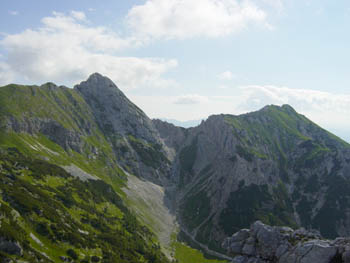 Mali Draški vrh in Viševnik (2050 m). Vmes je Srenjski preval (1995 m). Pod Viševnikom že lahko "slutimo" krnico Jezerce. |