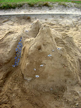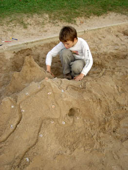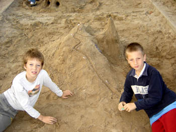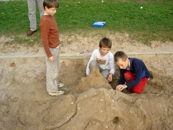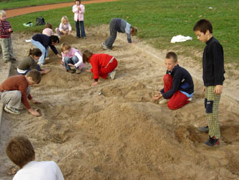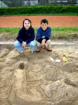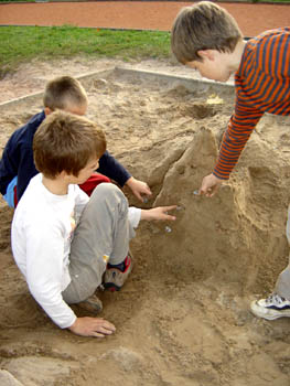 Tokrat so mladi trzinski planinci spoznavali markacije. Najbolj zanimiv del se je seveda odvijal zunaj, na igrišču. Naši najmlajši planinci so najprej "zgradili gore" (roko na srce - to že dobro obvladajo!), nato pa so novonastale hribe opremili z markacijami ...