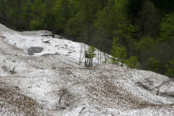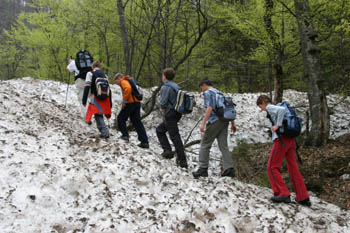 Za konec smo si ogledali še snežni plaz v čmaževki, malo nad Žagano pečjo. V zadnjih dneh je plaz, ki je prišel izpod čmaževskega turna po grapi, imenovani čmaževski plaz do kraja, imenovanega čmaževka (tam je sedaj veliko divjega česna, imenovanega čemaž ali po čmaž) ena največjih atrakcij v dolini – ostanke snežnega plazu, ki je zaprl cesto v Konec pač ne vidiš vsak dan ... |