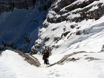 Pripravniška grapa, 40º, 250 m, prvi plezalci niso znani; smučarska ocena: III+, zgoraj S4+, 250 m, prvič presmučana 23. 1. 1982 |