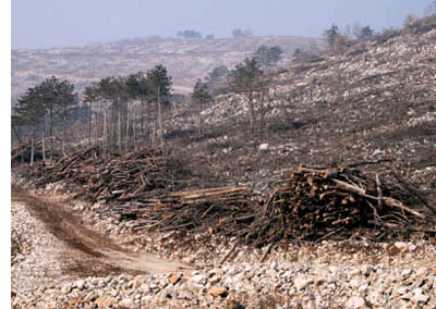 Eno največjih borovih požarišč pri nas je na Šumki, zahodno nad Branikom. Sanacija požara, ki je izbruhnil julija 2006 bo končana šele v letošnjem letu. |