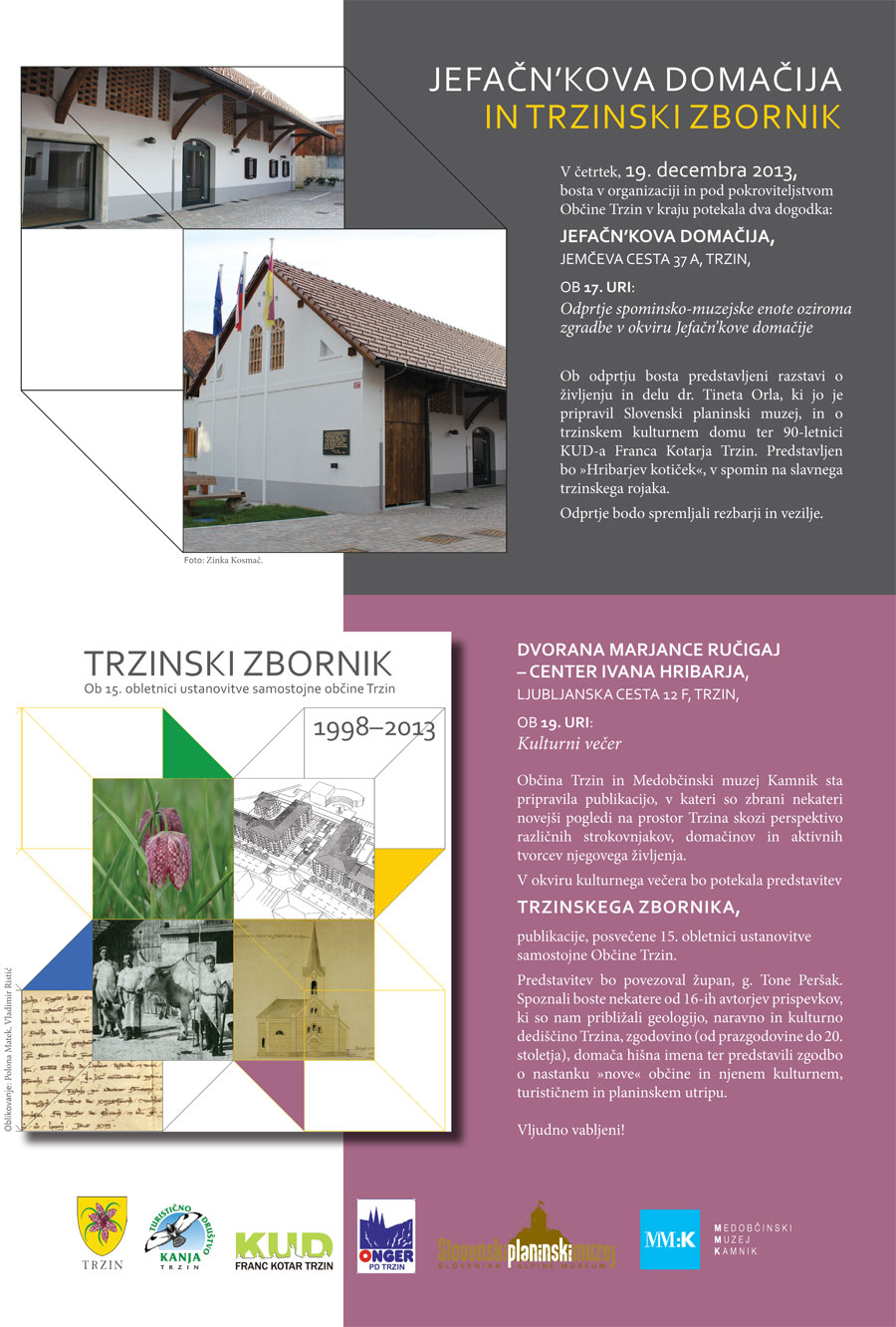 Občina Trzin, MMK, TD Kanja, PD Onger in KUD Franc Kotar vabijo na otvoritev spominsko-muzejske enote v okviru JEFAČNIKOVE DOMAČIJE (Jemčeva c. 37A), v četrtek, 19. 12. 2013, ob 17. uri in predstavitev TRZINSKEGA ZBORNIKA v okviru kulturnega večera, 19. 12. 2013, ob 19. uri.