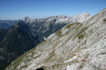 Južna pobočja Prisojnika – v ozadju sta najbolj izrazita Bavški Grintavec (levo) in Jalovec (desno) |