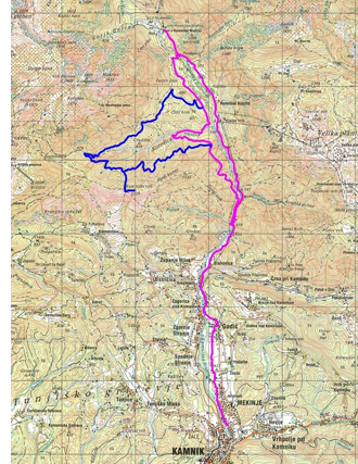 350 m vzpona, 28 km, V3, S2 (vijolična pot na zemljevidu)