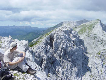 Simon na vrhu Malega Draškega vrha, desno od njega je zahodni vrh, v ozadju pa je Veliki Draški vrh.(foto: Boštjan)