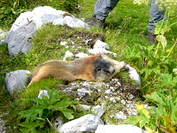 ... medtem ko druge – živali, ki prosto živijo - lovci preganjajo. Ubogi svizec ni imel sreče. Ni vedel, da jih lovci septembra in oktobra dovoljeno lovijo. |