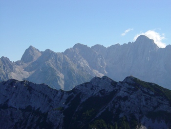 Nekaj »prvakov« Julijskih Alp: Špik, Lipnica, Velika Martuljška Ponca, Oltar ... Najvišja pa je seveda Škrlatica. Spredaj greben Kumlehov. |