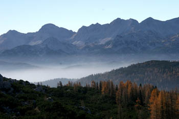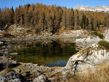 Na vrhu Komarče se je že dalo slutiti, kakšen lep dan se obeta. Pri črnem jezeru smo se prvič malce oddahnili ... (Foto: Boštjan) |