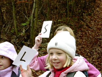 Sredi gozda smo naleteli na drevo, ki govori različne besede. Potrebno je bilo le dvigniti kartončke s prvo črko besede. |
