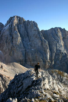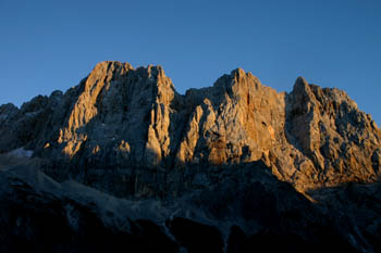Škrlatica, Rakova špica in Rogljica v večernem soncu. |