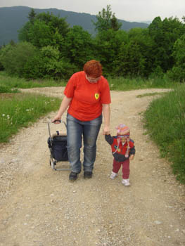 Za Tijo je bil hrib verjetno kar visok – zato se je »odločila«, da del poti prepotuje tudi na maminem hrbtu. |