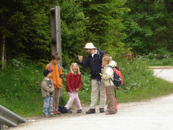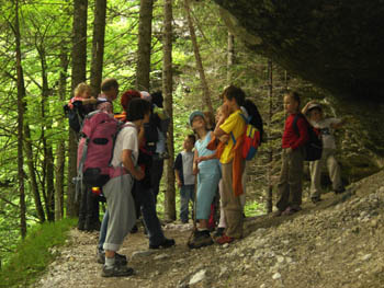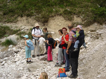 Potem smo se v drugem delu poti sprehodili pod Galerijami in dober kilometer še po cesti do Aljaževega doma. Še »skok« do spomenika – klina ter ob vrnitvi vzpon nekaterih na balvan »Mali Triglav«. Potem pa nas je pot odpeljala nazaj na izhodišče.