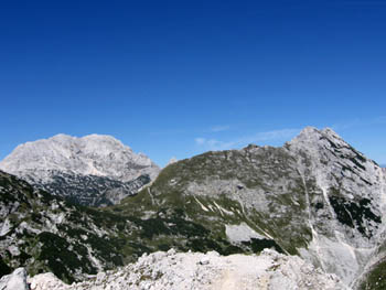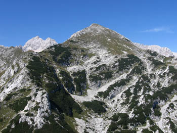 Veliki Draški vrh, zadaj levo pa nas pozdravlja Triglav. |