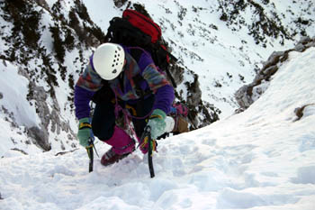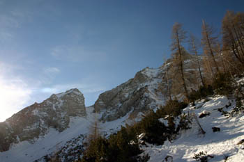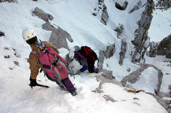 Sestop po Pripravniški grapi. Ob »dobrih zimah« so skalnati skoki lepo zaliti, letos pa … |