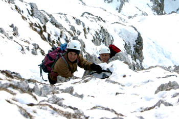 Mala Mojstrovka je bila konec lanskega leta med gorskimi cilji med Trzinci najbolj priljubljena. Najpogosteje je njene grape "premagoval" Lado, kot smo že objavili pa je bil zelo prizadeven tudi Tomaž, ob tem pa je treba omeniti še Bogdano in Dušana, da o spremljevalkah ne govorimo. Ni čudno, da so se zadnjo soboto v letu, nedogovorjeno na parkirišču na Vršiču srečali Bogdana, Lado in Miro. Prva dva sta imela plezalne namene in sta zraven povabila še Mira, ki se ni dal prositi.