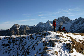 Obiskovalci vrha se razgledujejo. Zadaj je najvišja Mrzla gora. |