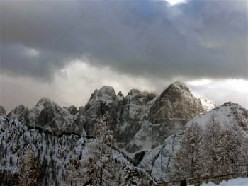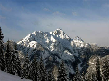 Višarje (Monte Lussari 1799 m), znana romarska gora, v ozadju kraljuje Mangart