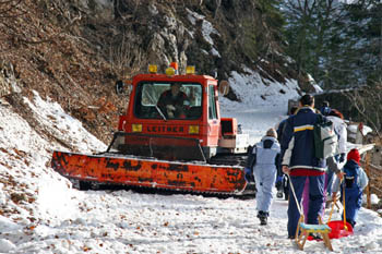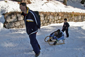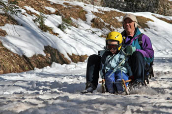 (Kako je bilo?) Vreme je bilo naravnost fantastično, vendar ko smo se peljali proti Ljubelju, ni bilo ne duha ne sluha o snegu. (Pa smo šli na sankanje, kajne?) Tudi na mejnem prehodu je bilo samo nekaj kupov snega. (Hmm, kaj bo s sankanjem?) Sicer je začetek poti bil kar obetaven in je zgledalo, da se bo možno sankat, vendar smo kmalu ugotovili, da so na več mestih luknje s kamenjem. (Takih zaviralnih mest si pa res nihče ne želi!!) Po približno pol poti pa je sledila odrešitev - ratrak, ki je je popravljal progo in zakrpal luknje. (Letos je bil ratrak odrešitev, lani pa ne – se jim je kakšen dan prezgodaj pokvaril!!!) Po dobri uri hoje smo prišli na stari Ljubelj in si v koči privoščili malico. (Prazen žakelj še nikoli ni stal – kako naj bi se pa peljal?) Po malici pa je sledil spust. (IIHHAAAA!!!) Proga je bila prav super - v zgornjem delu je bila dokaj trda, v spodnjem delu pa je bil sneg že zelo zmehčan. (Sankaško avanturo je kljub temu preživela 11-članska skupina neustrašnih: 4 otroci in 7 odraslih – kdo pravi, da je sankanje le za otroke ...?).