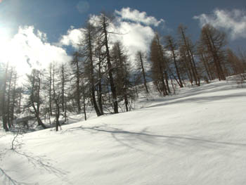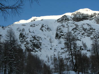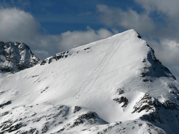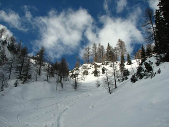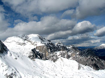 Z Velikega Draškega vrha so se ravnokar spustili trije smučarji |
