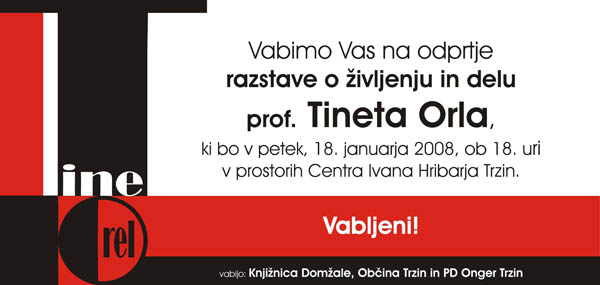 Vabimo vas, da se v petek, 18. januarja 2008 ob 18. uri udeležite odprtja razstave Življenje in delo prof. Tineta Orla. Razstava bo na ogled v avli Centra Ivana Hribarja v Trzinu.