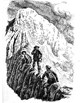 Risba Vlasta Kopača iz leta 1943 prikazuje, kako so morali prvopristopniki na Triglav 'jezditi' ostri greben med Malim in Velikim Triglavom. Greben so pozneje zaradi nadelave poti 'obdelali'. |
