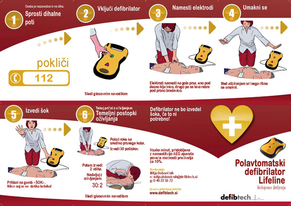 1. Odpremo in vključimo defibrilator ter sledimo govornim navodilom. Sodobni defibrilatorji govorijo v slovenskem jeziku.