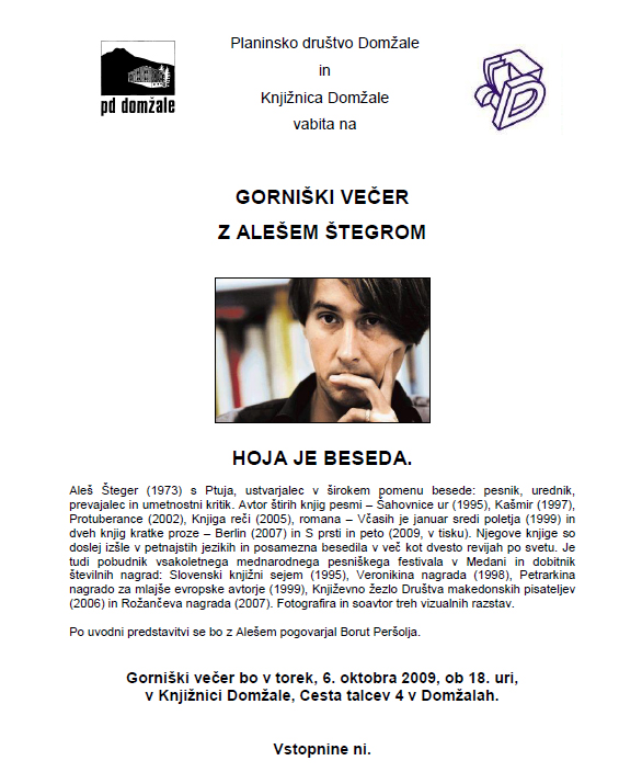 Gorniški večer bo v knjižnici Domžale, v torek, 6. oktobra 2009 ob 18 uri. Vstop prost.