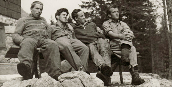 V Vratih po neuspelem poskusu v Bavarski smeri, pozimi leta 1949. Od leve: Rado Kočevar, Sandi Blažina, France Zupan in Marjan Keršič - Belač. (arhiv: Rado Kočevar)