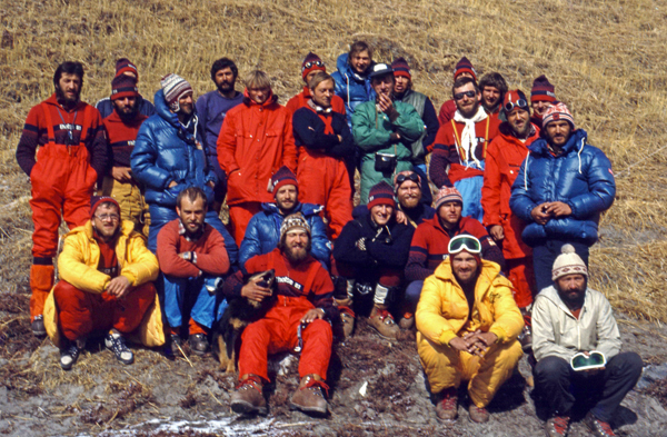 Peter Podgornik, Filip Bence – Tačrn, Aleš Kunaver – vodja (zakrit), Vanja Matijevec, Jovan Popovski (Makedonija), Željko Perko – Želo, Franček Knez, Marjan Kregar (zakrit), Rajko Kovač – Rok, Ivan Skumavc – čivč (kuhar), Jernej Zaplotnik – Nejc, Peter Markič – Pero (zakrit), Viki Grošelj, Janez Benkovič – Beni, Ivan Kotnik – Ivč, Slavko Frantar – čopek, Stipe Božič (Hrvaška), sedijo, od leve: Iztok Tomazin, Andrej Štremfelj, Miroslav Stankovič – Mika (snemalec RTV Novi Sad), Pavel Podgornik, Miro Šušteršič – čeha, Marko Štremfelj – Mk, Borut Bergant – čita, Janez Majdič (RTV Slovenija), Petar Antonijevič – Peka (novinar RTV Novi Sad). Na sliki manjkata Marjan Manfreda – Marjon in zdravnik odprave dr. Matija Horvat. Foto: Arhiv Petra Podgornika (vir: Planinski vestnik, 2011/04)