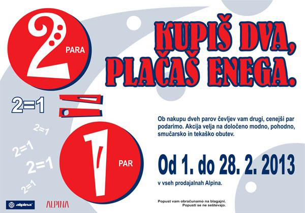 Alpinina akcija: kupiš dva para, plačaš enega! V času med 1. in 28. februarjem 2013 poteka akcija v vseh prodajalnah Alpine - Kupiš dva para, plačaš enega. Ob nakupu dveh parov čevljev, drugi, cenejši par podarijo.