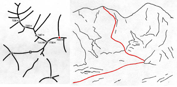 Levo: Grebenski zemljevid masiva Tirič Mira. Z rdečim trikotnikom označen Vzhodni Tirič Mir (7692 m). Desno: Risba smeri iz knjige Na vrhovih sveta, Mladinska knjiga, Ljubljana, 1992. Na levi je Vzhodni Tirič Mir (7692 m) z vrisano smerjo, na desni pa glavni vrh Tirič Mira (7708 m). Po besedah Mira pa je smer precej napačno vrisana.