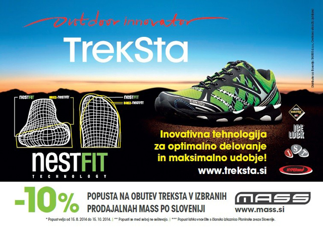 V izbranih prodajalnah Mass po Sloveniji lahko člani Planinske zveze Slovenije koristimo 10 % popust na vrhunsko pohodniško in tekaško obutev TrekSta. Ne zamudite priložnosti ugodnejšega nakupa, saj akcija traja le do 15. oktobra 2014.
