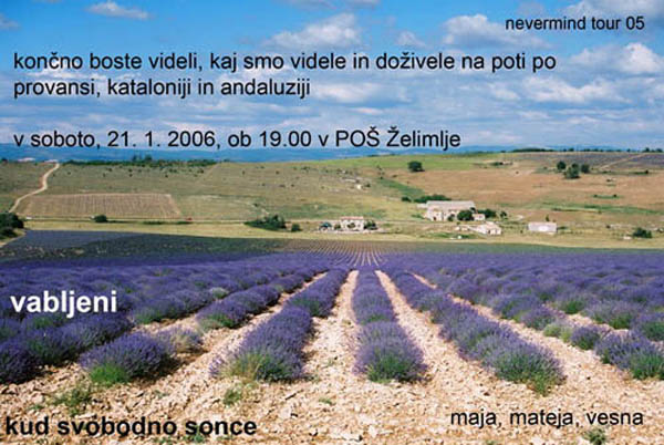 Ker v Trzinu trenutno čutimo precej veliko pomanjkanje zanimivih potopisnih predavanj, vas tokrat vabimo na predavanje naše članice v Želimlje! Skupaj s svojimi prijateljicami bo predstavila njihovo lanskoletno poletno potepanje. Obiskale so Provanso, Katalonijo in Andaluzijo. če vemo, kako znajo biti španske pokrajine slikovite, skok do podružnične šole v Želimljah (šola stoji poleg gimnazije v Želimljah) v soboto, 21. 1. 2006 ob 19. uri, ne bo pretežak zalogaj.
